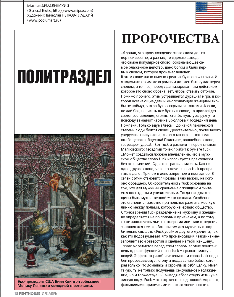 Если бы "неприличный" сайт Пентхауса был бы в приличном состоянии, то есть содержал бы материалы номеров в архиве, то моё и обо мне было бы доступно всем. А так пройдёт декабрь, номер буквально задрочат и заменят следующим, а библиотеки носы воротят от Пента и таким образом декабрьский номер канет в вечность с остальными номерами, не помещёнными в вечный интернет.