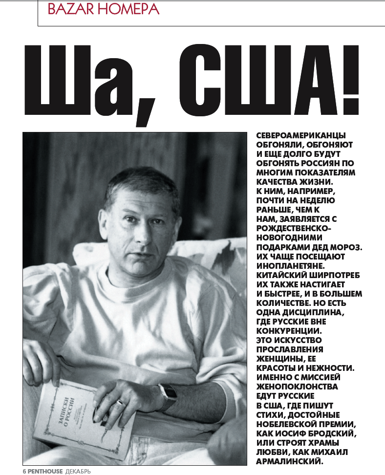 Название Пентхаус придумал, не ведая о том, что имеется роман Льва Халифа "Ша, я еду в США". Истинный текст статьи Ф. Рюхеля я привожу ниже для истинности и удобства чтения.