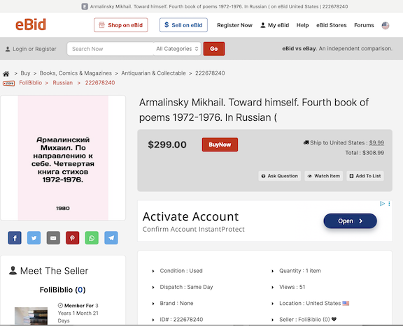 На сайте eBid, конкурирующим с eBay, мою книжку стихов По направлению к себе продают за $299, а остальные – всего по $199.